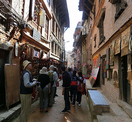中世のレンガで作られた街並みがそのまま残り、世界遺産のバクタプルの観光です。高く聳える五重塔(ニャタポラ寺院)、旧王宮、そして迷路のように入り組んだ路地裏にご案内。カトマンズに来たからには、ここは外せません。