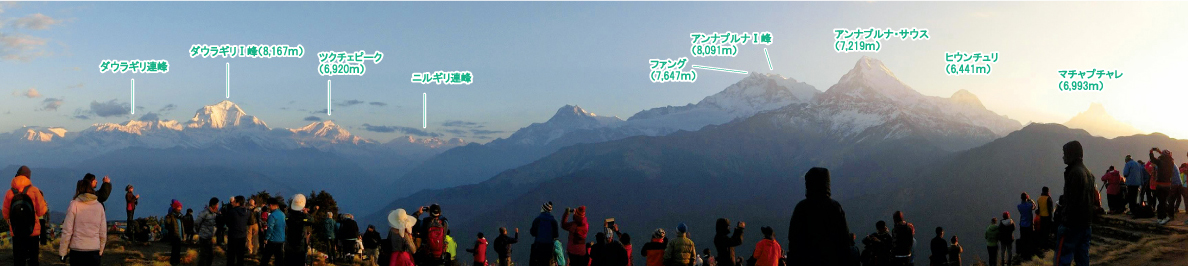絶景、朝日に輝くアンナプルナ山群とダウラギリ山群