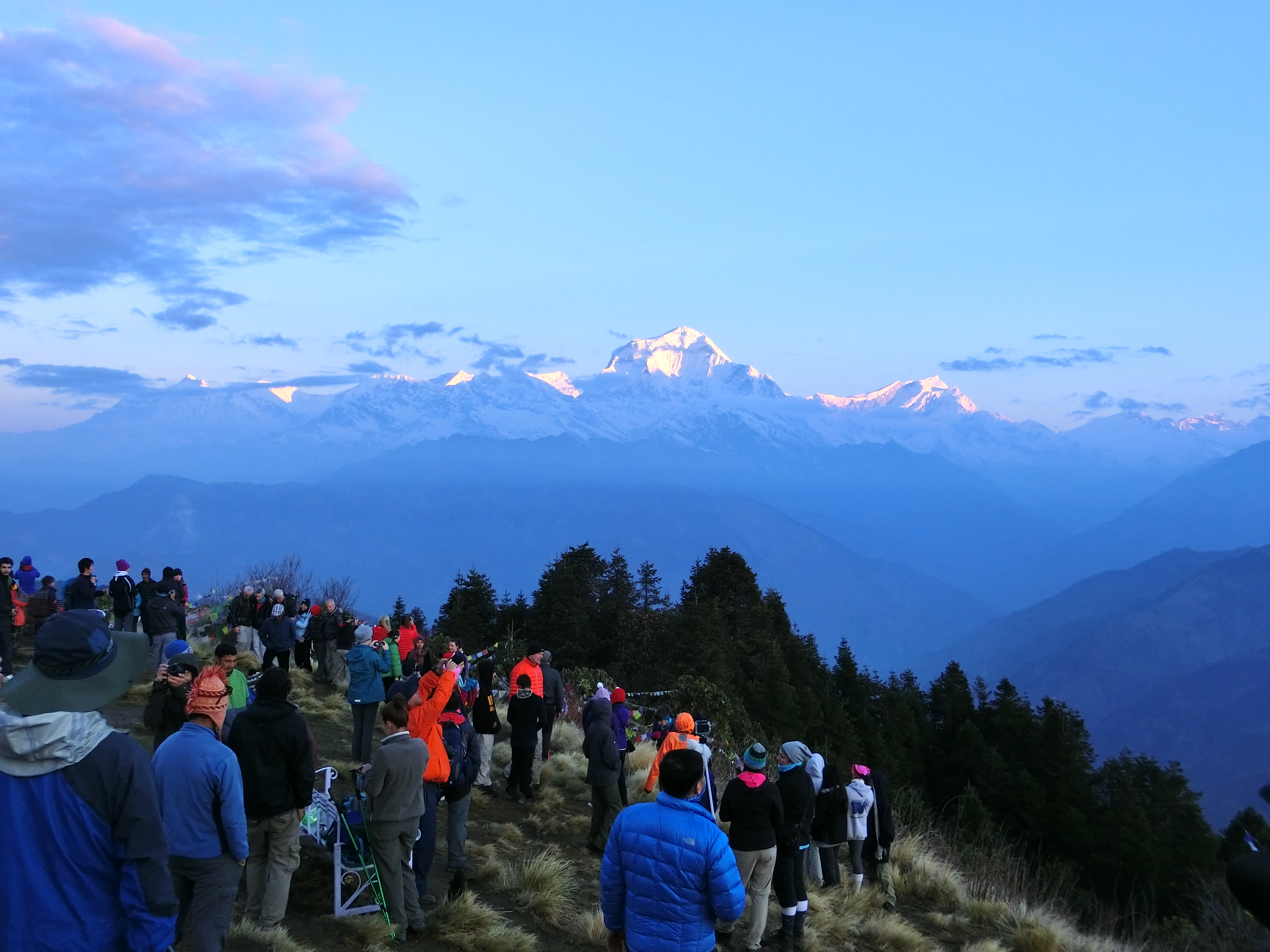 僅かな時間に刻々と変わる空の色、ヒマラヤの輝きは、見逃せません。 夜明け前に登り寒さに耐えて待つ価値がある絶景です。
