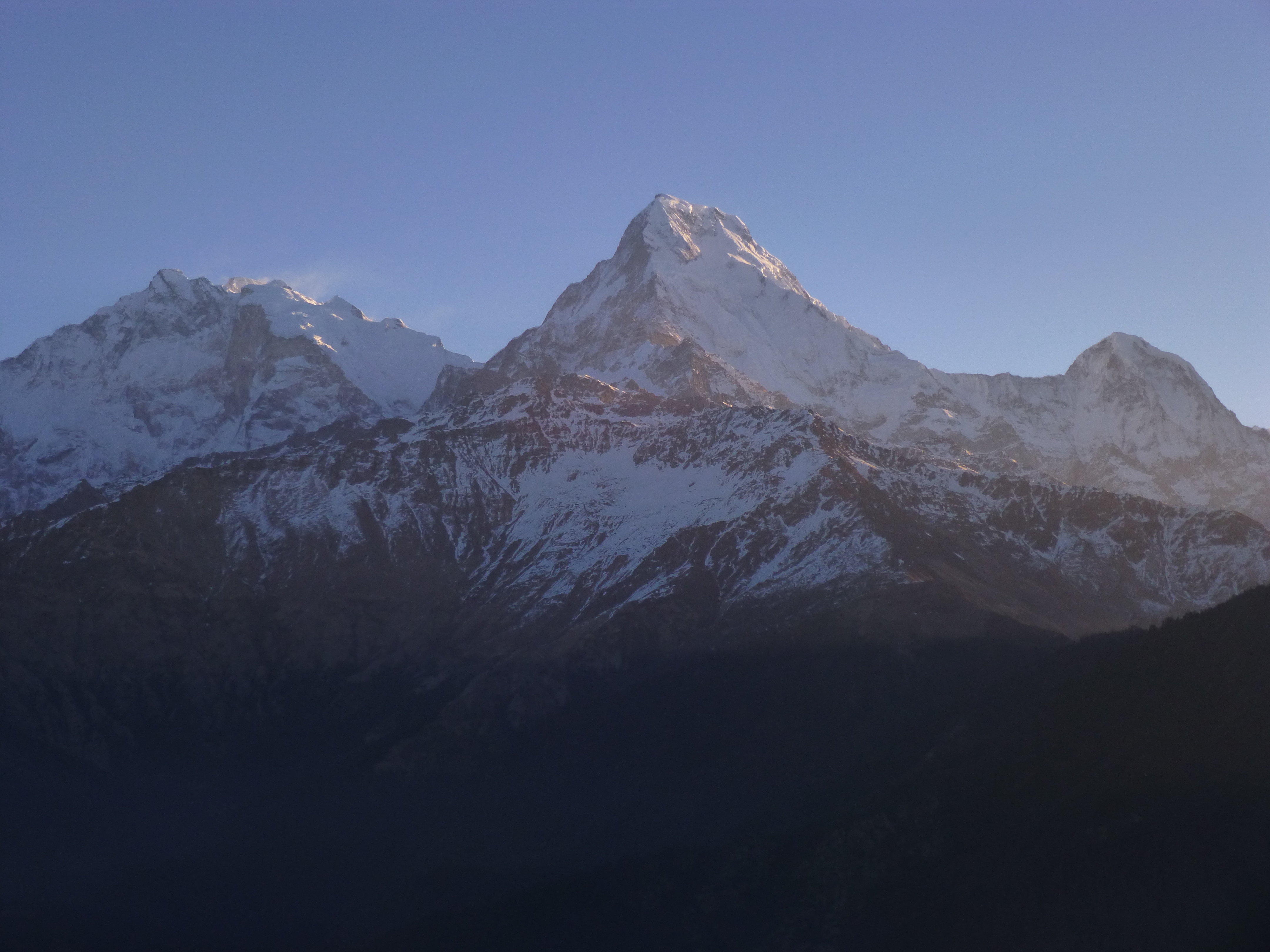 黎明の時、白々と明けてくる東の空からの光が、まずダウラギリⅠ峰の頂上に突き刺さります。そしてその光がアンナプルナⅠ峰を照らし輝き始めます。