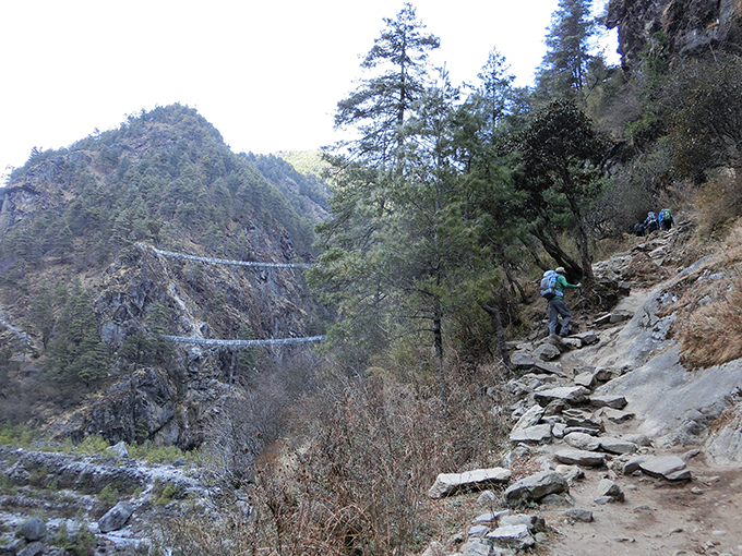 エベレスト街道のトレッキング開始。ドーゥドコシ(乳の川)の谷沿いの道をゆるい登り下りを繰り返しながらパグディンへ(歩行約4時間)。