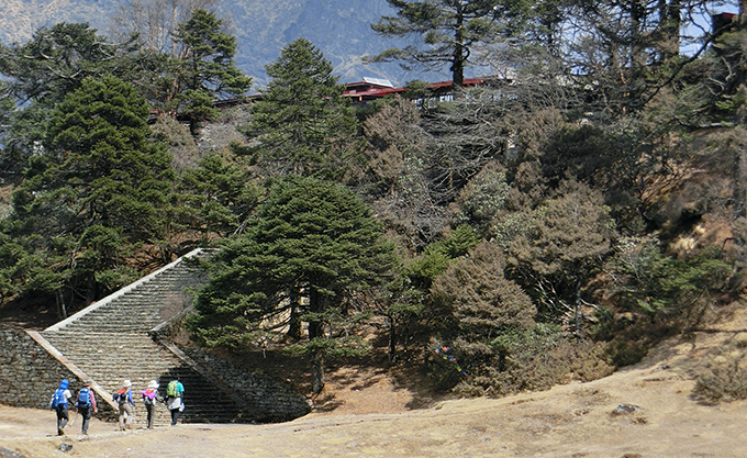 ドーゥドコシ沿いの道をジョサレへ巡り、エベレスト国立公園の入園手続き。標高差う約600mの坂をゆっくり登りきるとナムチェに到着です(歩行約6時間)。